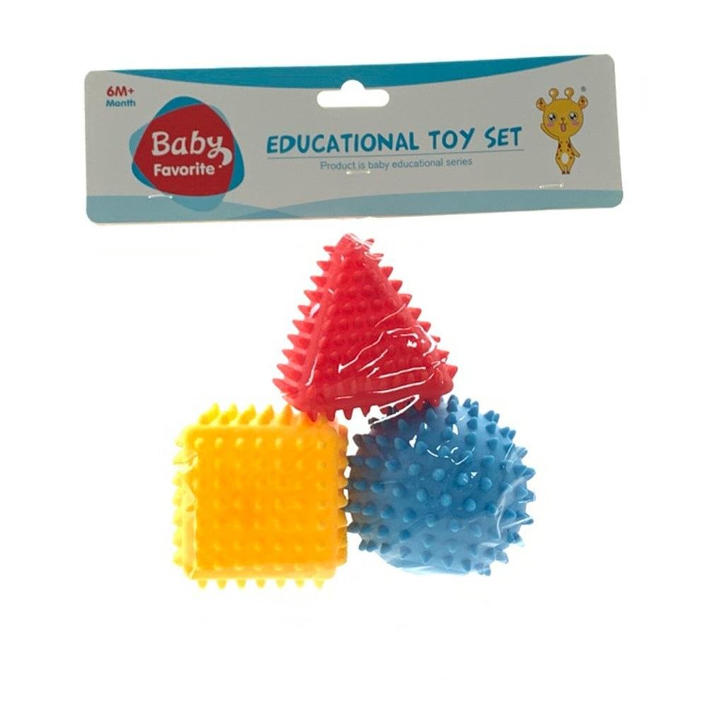 Zestaw trzech piłek sensorycznych w kształcie kuli, kwadratu i trójkąta. przeczytaj całość
