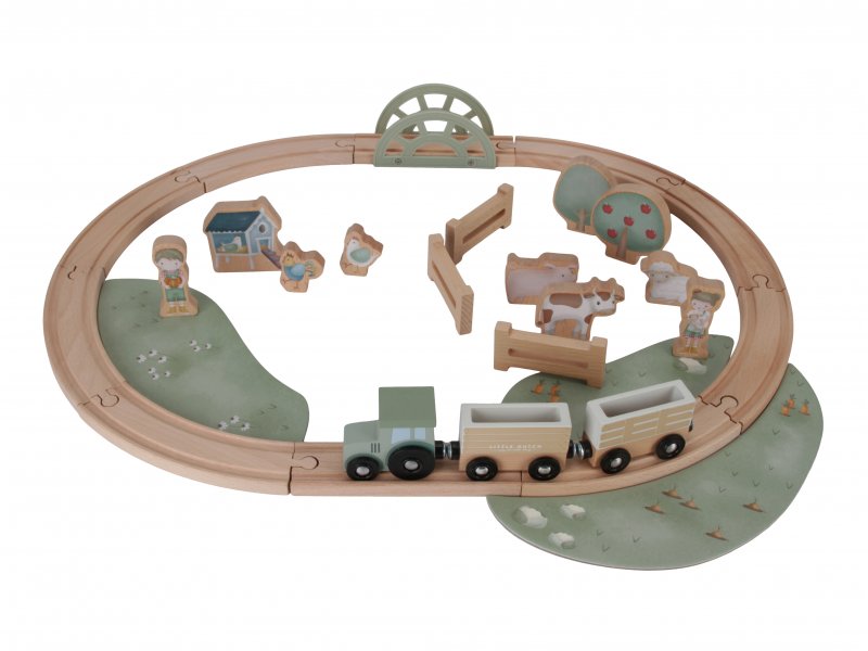 Kolejka zawiera kompletny zestaw 10 elementów torów, lokomotywę z dwoma wagonikami oraz 13 akcesoriów przedstawiających życie na farmie - od zwierzątek przez postacie aż po drzewa. Wszystkie elementy są zadrukowane z obu stron, a zwierzątka mają odpowiedni rozmiar, aby można je było umieścić w wagonikach, co pozwala dzieciom wymyślać własne historie i przygody podczas podróży pociągiem.