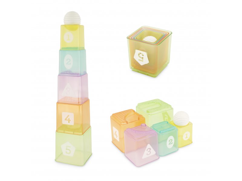 Sada obsahuje jeden míček a pět barevných stohovacích kelímků, které můžete stavět až do výšky nebo naopak vkládat do sebe. Průhledné kelímky jsou potištěné geometrickými tvary a čísly a můžete tak s jejich pomocí batole učit rozeznávat barvy, tvary i čísla. S míčkem můžete vymýšlet různé...