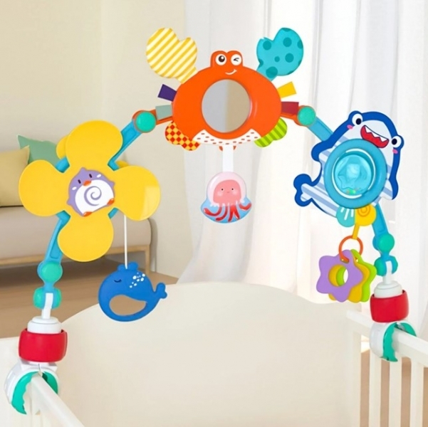 Oblouk s hračkami - Mořské zvířátka. Hračka přitahuje pozornost a udržuje aktivitu a zvědavost dítěte při pobytu v kočárku nebo autosedačce. Navrženo tak,... przeczytaj całość