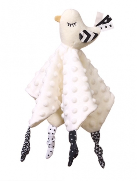 Little Birdie je funkční produkt dva v jednom: deka a plyšová hračka. Je to také vzdělávací hračka. Rozvíjí smysly miminka od prvních dnů života. Minky bavlněný materiál má texturu s drobnými cvočky, které stimulují hmat. Podobně měkké uzly nebo stuhy podporují úchopová cvičení. Materiál je vzdušný a jemný.