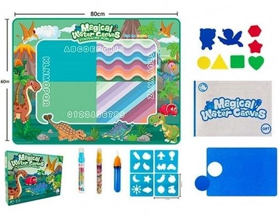 Mata do kolorowania wodnym pisakiem DIino 80x60cm Mata do wielokrotnego użycia, uczy dziecko kreatywności. Sposób użycia: należy napełnić wodą dołączone mazaki, pomaluj mazakiem poszczególne elementy rysunku na macie, po skończonym kolorowaniu poczekaj kilka minut a rysunek na macie powróci do swojego pierwotnego stanu i będzie gotowy do ponownej zabawy. W zestawie szablony i inne akcesoria.