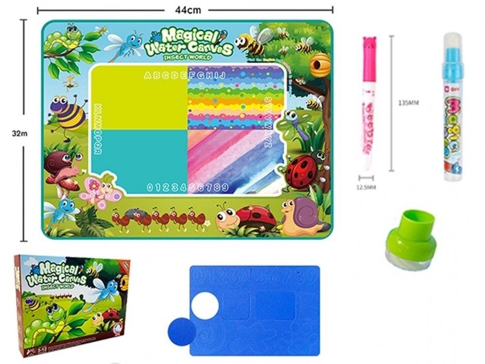 Mata do kolorowania wodnym pisakiem owady 44x32cm Mata do wielokrotnego użycia, uczy dziecko kreatywności. Sposób użycia:należy napełnić wodą dołączone mazaki, pomaluj mazakiem poszczególne elementy rysunku na macie, po skończonym kolorowaniu poczekaj kilka minut a rysunek na macie powróci do...