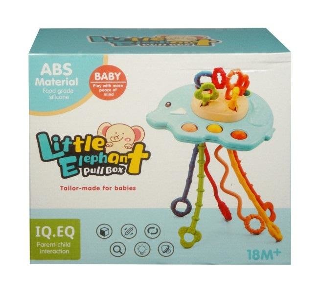 Plastikowo-gumowa zabawka dla malucha. Zabawka ma kształt słonika i posiada kolorowe gumowe linki w różnych kształtach i kolorach, które dzieci mogą przeciągać. Linki wykonane z bezpiecznej gumy, które dzieci mogą brać do buzi. Zabawka posiada również popularną zabawę pop it. Zabawka rozwija u...