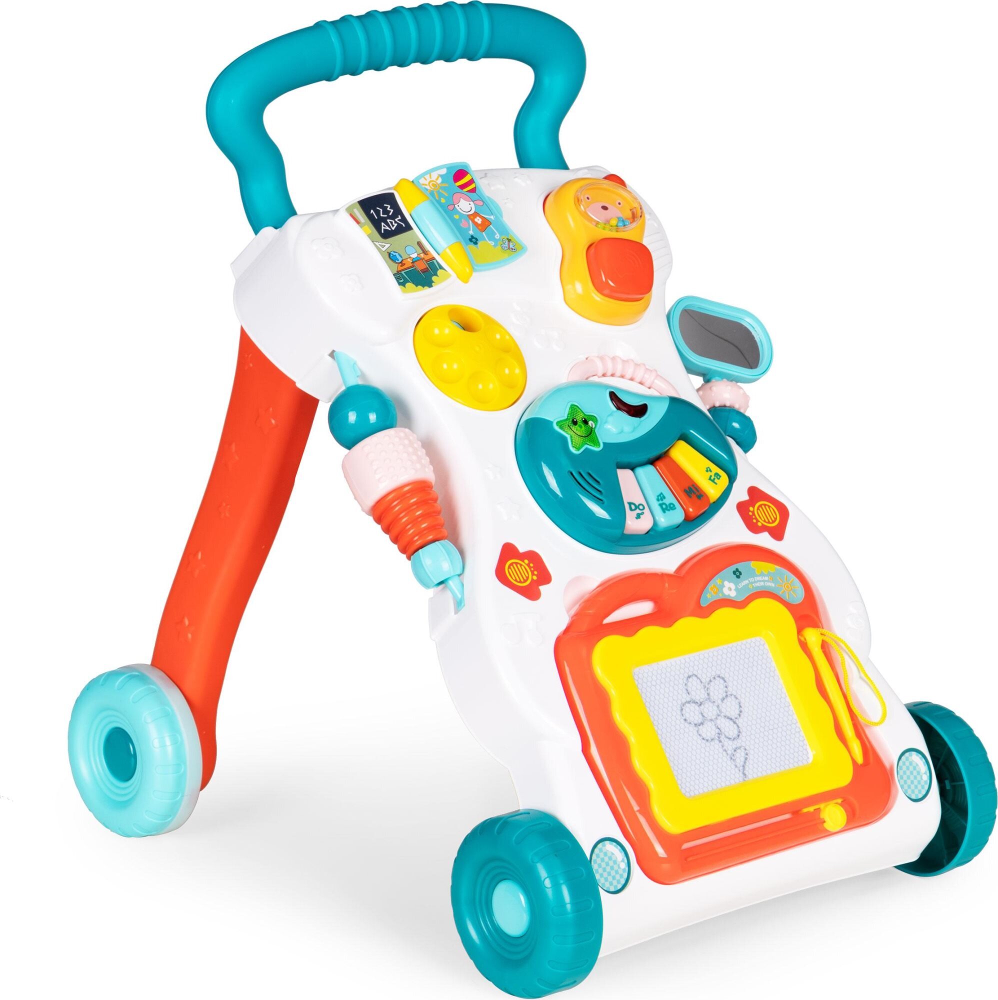 Ten chodzik oferuje wielofunkcyjną tablicę zabaw pełną barw i dźwięków, które pobudzają kreatywność oraz wspomagają rozwój słuchu i wzroku. Dzięki różnorodnym grom i melodiom dziecko pozostaje zmotywowane do zabawy, jednocześnie wzmacniając równowagę i koordynację. Odłączana tablica do rysowania oraz moduł muzyczny dodają dodatkowych możliwości zabawy i odkrywania.