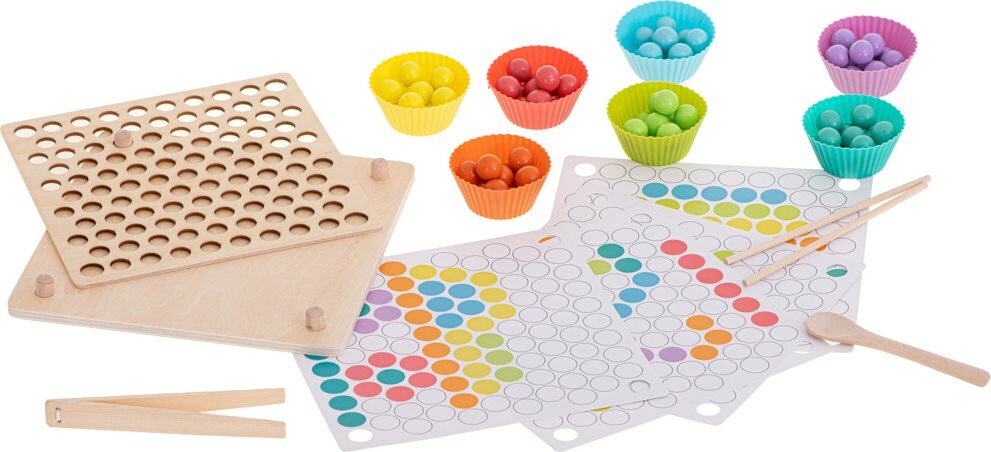 Zestaw zawiera 77 kolorowych drewnianych kuleczek w 7 wyrazistych kolorach, które można dowolnie umieszczać na drewnianej planszy. Dołączone są 8 papierowych szablonów, które pomogą w tworzeniu pięknych mozaik, a także akcesoria takie jak pęseta, łyżeczka i 2 pałeczki, dzięki którym manipulowanie kuleczkami jest zabawne i rozwijające. Kolorowe miseczki ułatwiają organizację i sortowanie kuleczek.