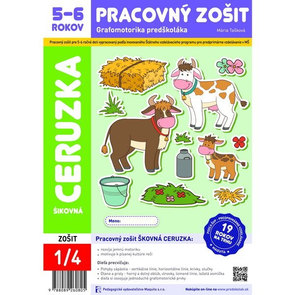 Cieľom edukačného pracovného zošita je podporiť charakter Štátneho vzdelávacieho programu: Vzdelávaciu oblasť - Jazyk a komunikácia. A to druhú časť výkonových a obsahových štandardov zameranú na Písanie reči, podoblasť Grafomotoriky.