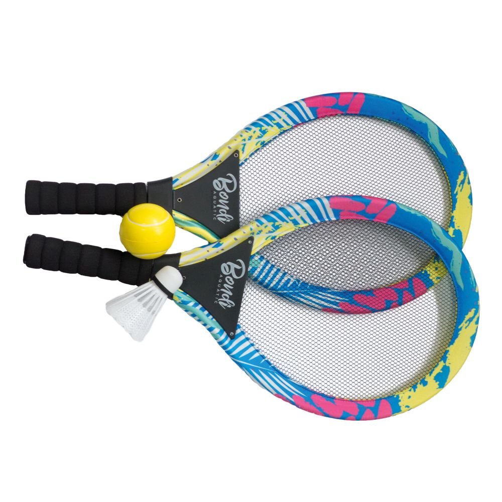 Barevný neoprenový hrací set pálek vhodný jak na pláž tak do vody. Set obsahuje měkký pěnový míček a badmintonový košíček. przeczytaj całość