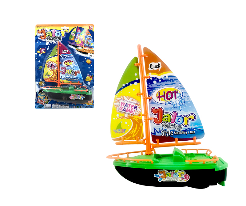 Barevná plachetnice na baterie, která na vodě pluje. przeczytaj całość