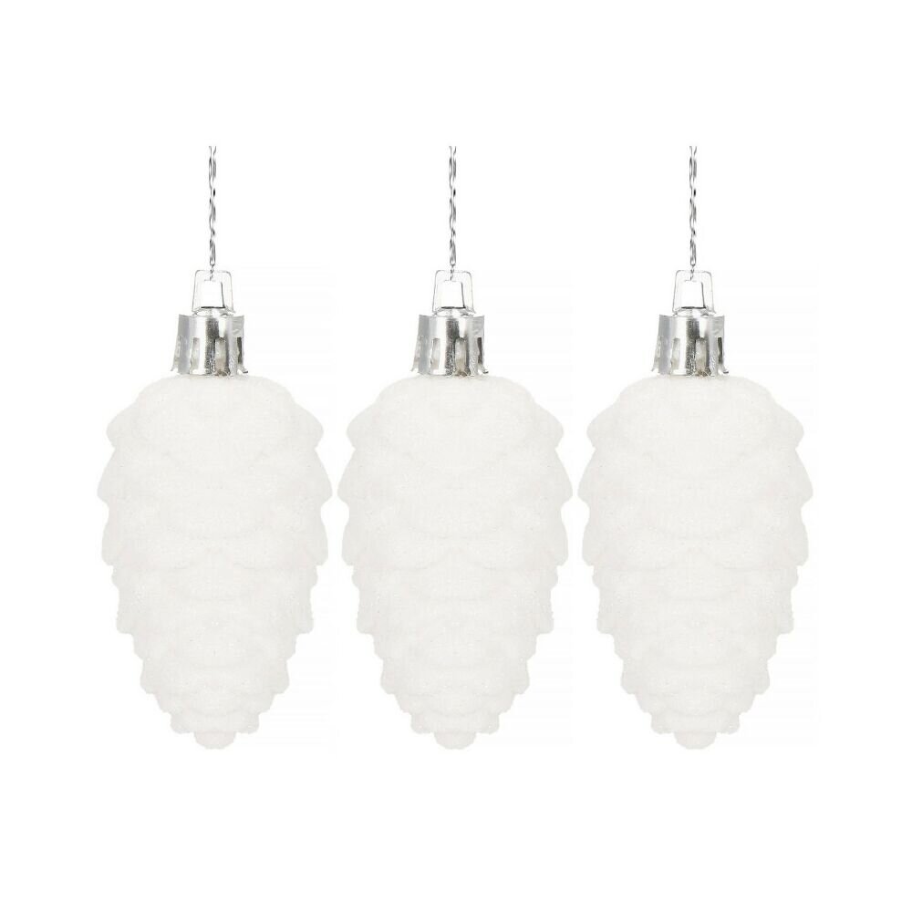 Sada 3ks bílých třpytivých šišek s provázkem na zavěšení. Výška 9 cm, nerozbitný, plastový materiál. Ideální k výzdobě stromečků nebo jako vánoční dekorace. przeczytaj całość