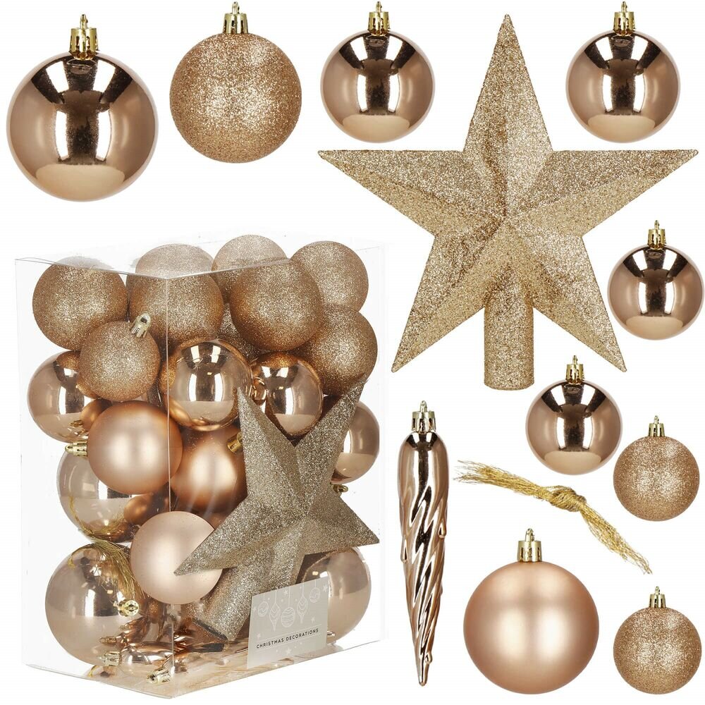 Luxusní 33 dílná sada vánočních ozdob na stromeček. Set tvoří 3 různé vzory ozdob zlaté barvy + překrásná hvězda na špičku stromku. Vše z nerozbitného plastového materiálu. Ideální k výzdobě stromečku nebo jako vánoční dekorace. Zdarma provázky pro snadné zavěšení.Luxusní kolekce vánočních...
