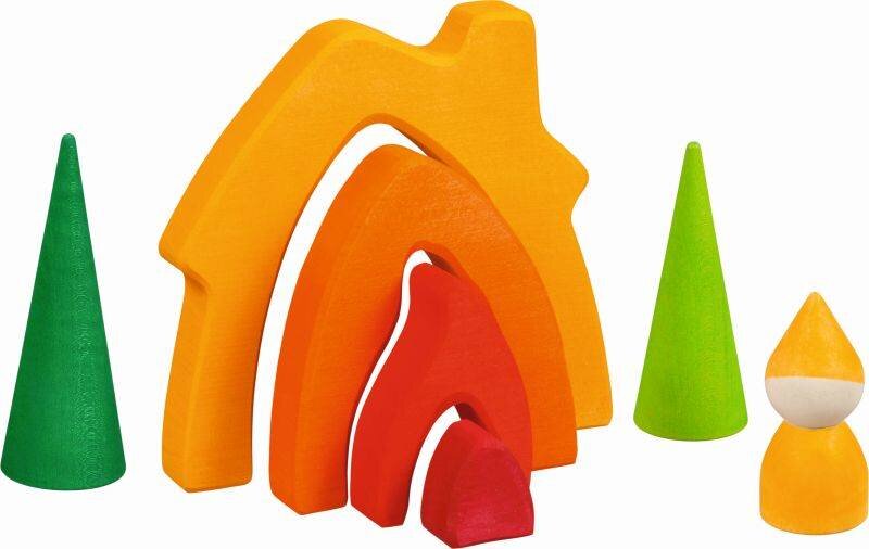Ten pięknie zaprojektowany drewniany domek został wyprodukowany w Europie. Wieloczęściowa konstrukcja, którą można układać na wiele sposobów, pobudza wyobraźnię. Zabawka jest jedną z serii Goki Evolution. Choinki i figurka Krasnoludka są częścią zestawu. Wymiary: 14,6 x 2,2 x 13,9 cm  przeczytaj całość