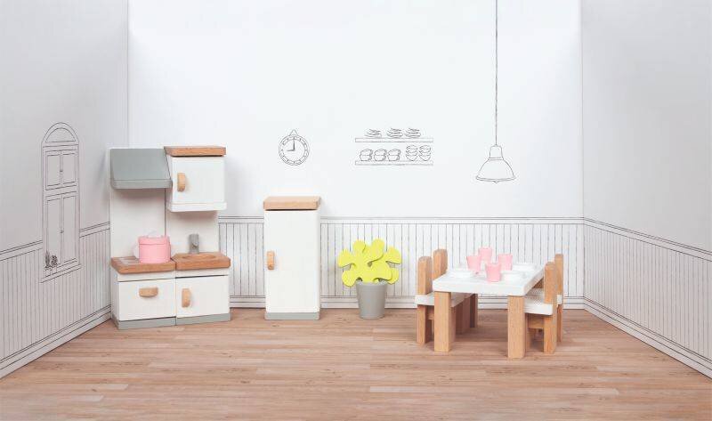Komplet stylowych mebelków umożliwiający aranżację kuchni i jadalni w domku dla lalek. Wszystkie elementy wyglądają bardzo realistycznie. Odgrywanie scenek z udziałem laleczek wpływa na rozwój wyobraźni i kreatywności dziecka. Niewielkie kubeczki, garnek czy roślinka doniczkowa nadają zestawowi... przeczytaj całość