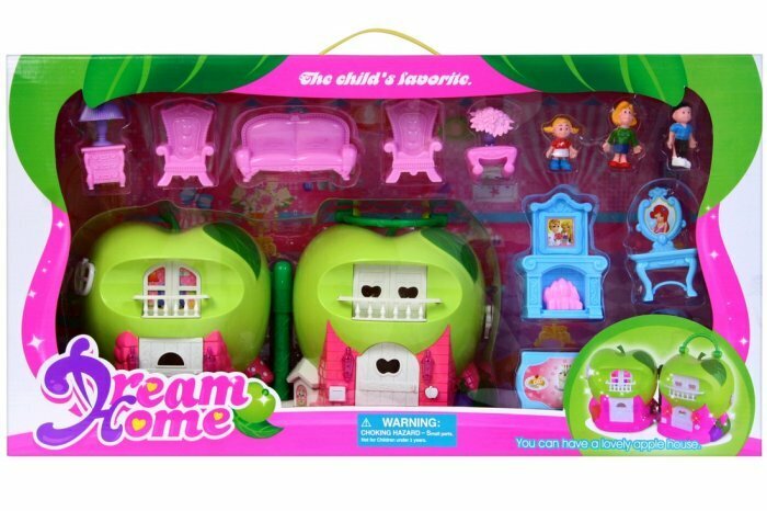 Uroczy domek w kształcie zielonego jabłuszka.Składany domek z otwieranymi drzwiami z rączką, po skończonej zabawie domek można złożyć i zapiąć z pomocą haczyka. Dużo miejsca do zabawy!Z efektami świetlnymi i dźwiękowymi. W zestawie: 3 figurki rodziny, kominek, toaletka, stolik, fotele, kanapa, stolik z lampą, stół.Baterie: 3 x L1154Wymiary opakowania:33,5x14,5x62 cmWiek: 3+