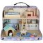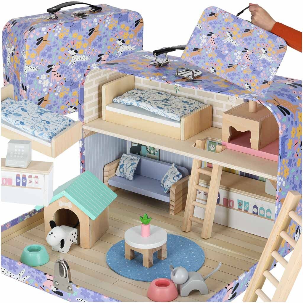 Kouzelný domeček v kufříku pro milovníky zvířátek přináší dvoupatrové mini bydlení plné detailů a doplňků. Snadno se přenáší díky praktickému uchu, po hře vše rychle uklidíte zpět do kufříku a pokoj zůstane bez nepořádku. Dřevěný nábytek, pejsek a kočička s vlastními miskami, budkou a škrabadlem...