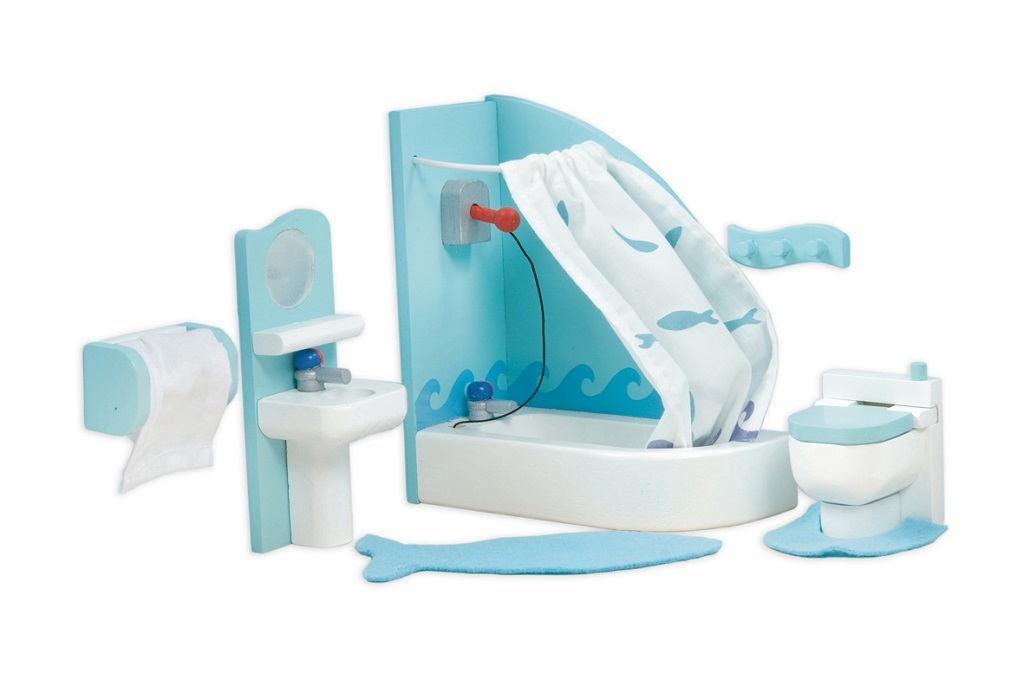 Dřevěný malovaný nábytek do koupelny obsahuje rohovou vanu se sprchovacím závěsem, umyvadlo se zrcadlem, toaletu, držák ma ručníky. Textilní doplňky jsou vyrobeny ručně. Britská značka Le Toy Van výrábí tradiční, vysoce kvalitní, prémiové dřevěné hračky v moderním designu. Kvalitu hraček...