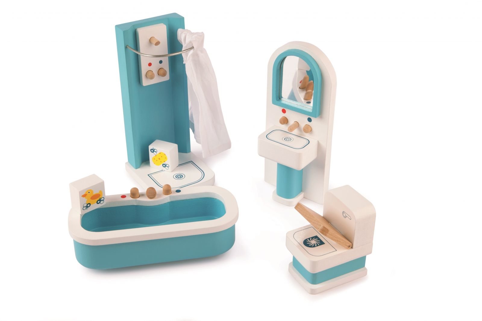Krásný nábytek z bukového dřeva se bude hodit do každého domečku pro panenky, má prostě vše, co budou děti potřebovat k vytvoření koupelny pro panenky, které se potřebují o sebe postarat po celém dni plném her. Set o šesti kusech zahrnuje sprchový kout s textilním závěsem, vanu, umyvadlo se...