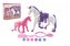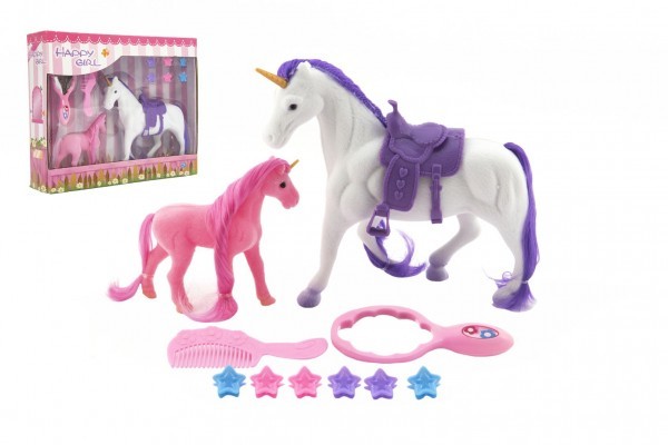 Jednorožec kůň česací se sedlem s hříbětem fliška plast s doplňky v krabici 29x24x7cm