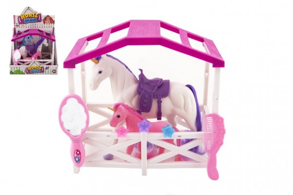 Jednorožec kůň se sedlem s hříbětem česací fliška plast s doplňky s ohradou v krabici 23x20x15cm