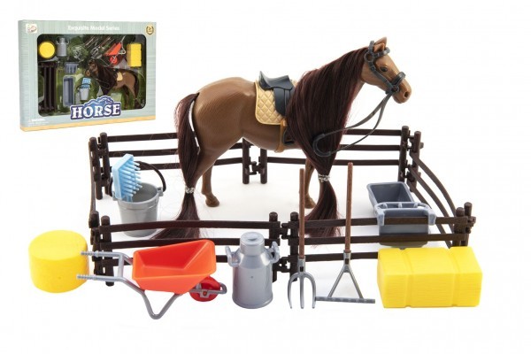 Kůň česací hnědý plast s doplňky a ohradou v krabici 34x25x5cm