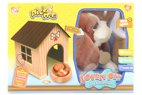 Pluszowy piesek z kartonową budą i akcesoriami. Opakowanie zawiera pluszowego psa o wymiarach ok. 19 x 12 cm, budę, ochronny kołnierz, miskę, stetoskop, strzykawkę i inne akcesoria. Wymiary opakowania ok. 30,5 x 21,5 x 19 cm. Wiek 3+ przeczytaj całość