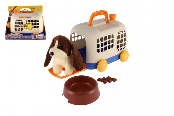 Pes/Pejsek v přepravním boxu plast/plyš 30x21cm s miskou s pamlsky v krabici 32x22x24cm