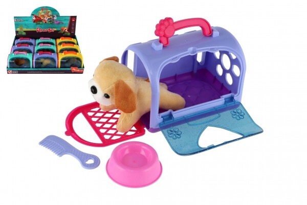 Pes/Pejsek v přepravním boxu plast/látka 13cm s doplňky 9ks v boxu