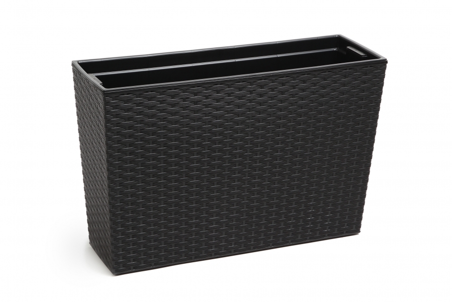 Nowoczesna plastikowa doniczka WERBENA RATAN składa się z dwóch części: plastikowej obudowy i wyjmowanej wkładki.