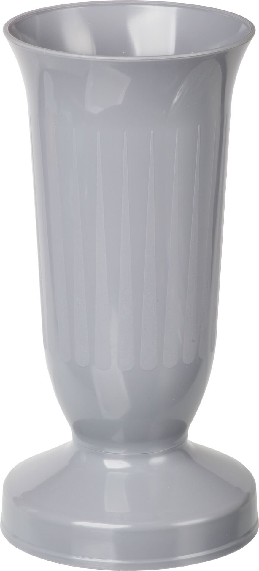 Ta waza jest wykonana z wysokiej jakości plastiku, a jej stabilność zapewnia obciążenie w podstawie, które zapobiega przewróceniu nawet przy silniejszym wietrze. Jej nowoczesny szary kolor dyskretnie uzupełni każdą przestrzeń cmentarną. Kompaktowe wymiary - wysokość 23,4 cm i średnica podstawy 12 cm - umożliwiają łatwe umieszczenie na grobie bez zbędnego zajmowania miejsca, a jednocześnie pomieszczą wystarczającą ilość kwiatów o pojemności 0,95 l.