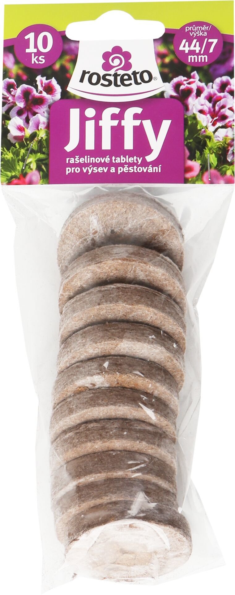 Jiffy są wykonane z wysokiej jakości torfu z dodatkiem wapna i wzbogacone podstawowymi składnikami odżywczymi. Są wyposażone w rozkładalną siatkę, która utrzymuje kształt po napęcznieniu. Stosuje się je do ukorzeniania sadzonek, pikowania i rozmnażania np. truskawek. Opakowanie zawiera 10 szt.