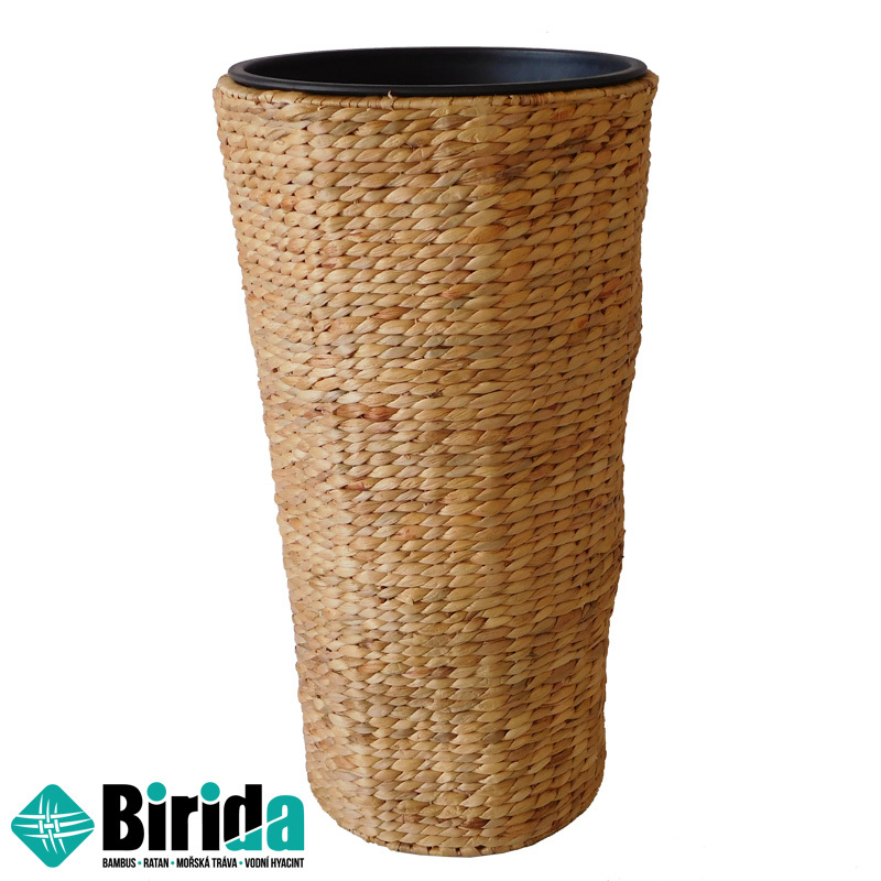 Plastový květináč oplétaný vodním hyacintem. Kruhový průměr květináče, vyztužený kovovým rámečkem, barva - přírodní světlá, vnitřní plastový korpus - černý. przeczytaj całość