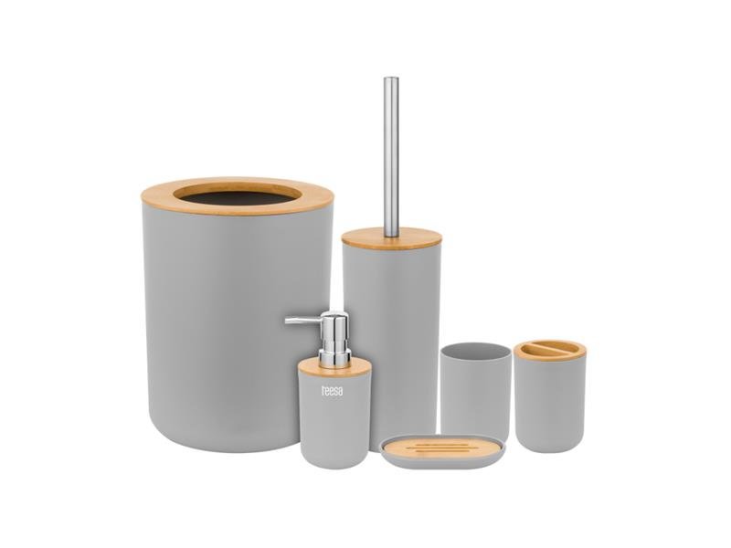 Sada koupelnových doplňkůTechnické parametry:- Materiál: ABS + PP + nerez + bambus- Barva: šedá + bambus- Objem dávkovače mýdla: 330 ml- Objem koše: 6 l- Rozměry / hmotnost dávkovače: 7,5 x 7,5 x 16,5 mm / 75 g- Rozměry / hmotnost kelímku: 7,5 x 7,5 x 10,3 mm / 33 g- Rozměry /...