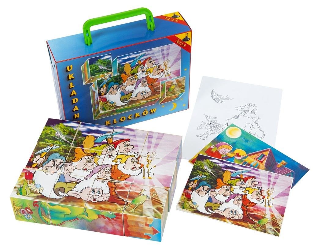 Zestaw 12 kostek w kształcie sześcianów. Na każdej ściance klocka naklejony jest inny fragment układanki. Dziecko układając klocki ćwiczy zdolności manualne, pamięć oraz wyobraźnię. przeczytaj całość