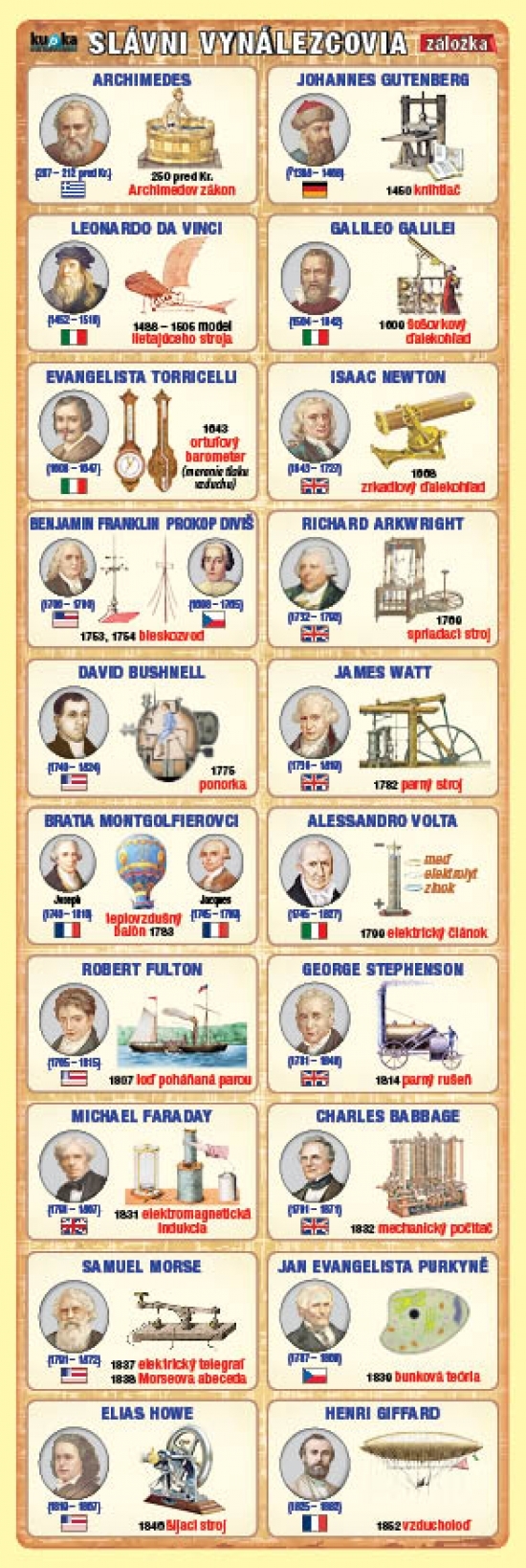 Záložka obsahuje prehľad 45 slávnych vynálezcov vrátane ich portrétov a zobrazení ich najvýznamnejších vynálezov. Pre úplnosť nechýbajú dátumy vynálezov, národnosti vynálezcov a dátumy ich narodenia a úmrtia. przeczytaj całość