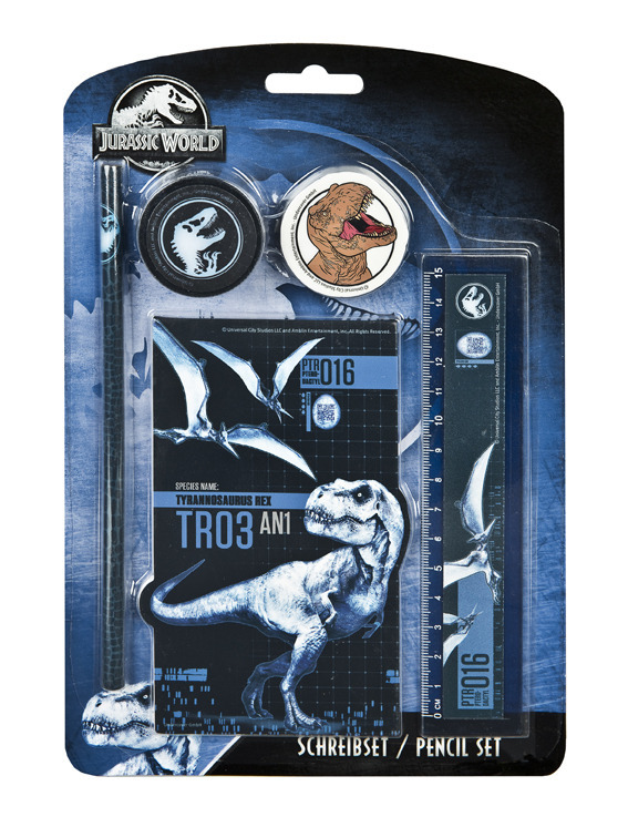 Zestaw szkolny Świat Jurajski - 5 szt. zawiera ołówek, temperówkę, gumkę, linijkę i notatnik. przeczytaj całość