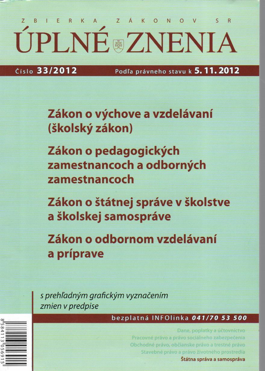 Úplné znenie zákona č.596/2003 Z.z. o štátnej správe v školstve a školskej samospráve po zmene zákonom č.325/2012 Z.z.
