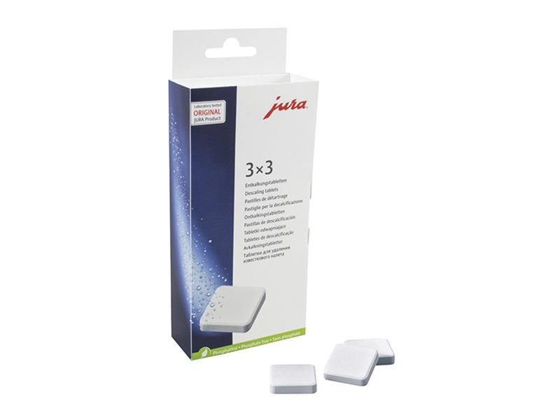 Odvápňovací tablety Jura prodlužují životnost kávovaru odstraněním vodního kamene a jsou k zařízení velmi šetrné. Tablety Jura jsou vhodné pro všechna zařízení na výrobu kávy a současně mohou být použity k odstranění vodního kamene u všech ostatních domácích spotřebičů. Odvápňovací cyklus by se měl opakovat po 50ti litrech spotřebované vody. Na jeden proces odstraňování vodního kamene je zapotřebí rozpustit 3 tablety v nádržce o objemu 0,6 litru, přičemž délka odvápňovacího procesu se odvíjí od typu kávovaru.