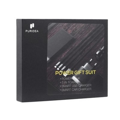 Dárkový box Puridea G4 - power bank, nabíječka, 3x data kabel, CL nabíječ, barva černá (kůže)