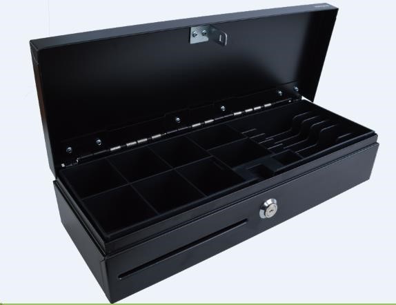 Virtuos pokladní zásuvka FT-460C Flip top, s víkem, 9-24V, černá - s kabelem