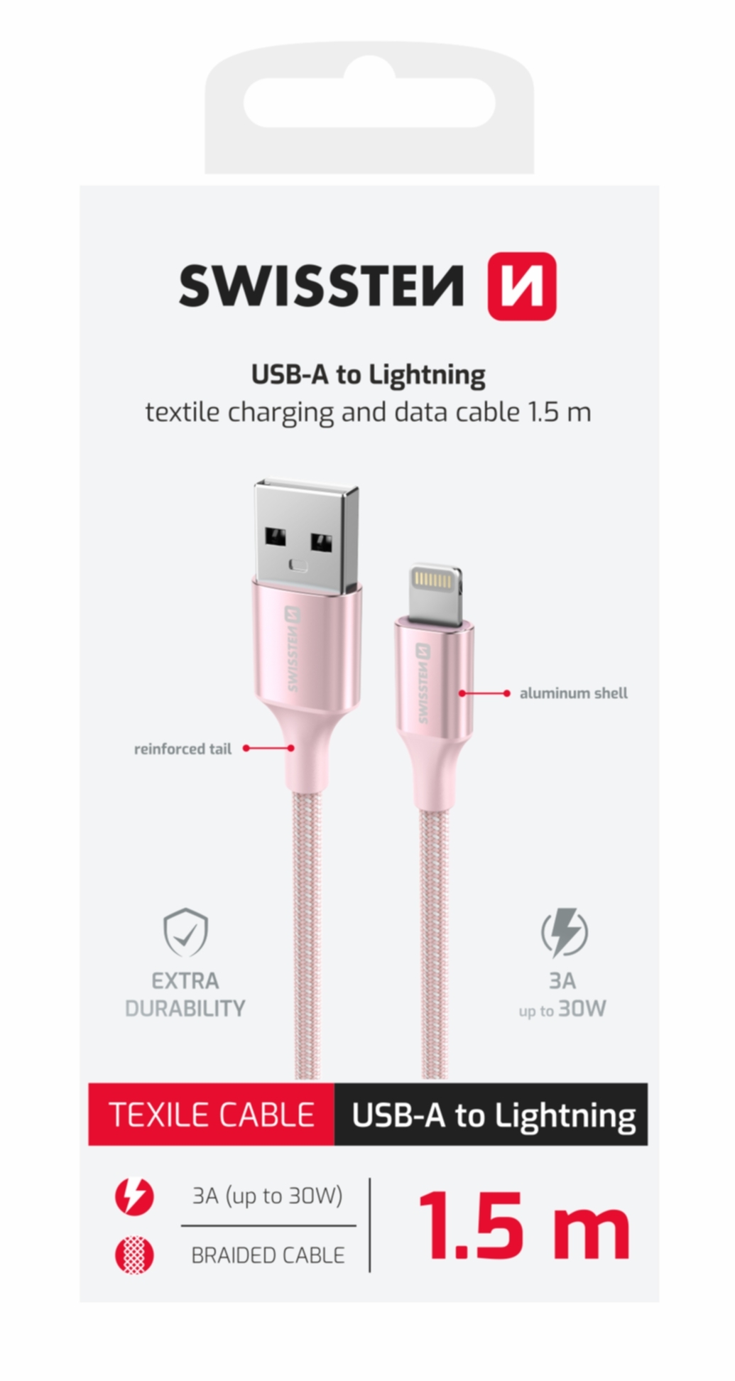 DATOVÝ KABEL SWISSTEN TEXTILE II USB / LIGHTNING 1,5 M RŮŽOVÝ