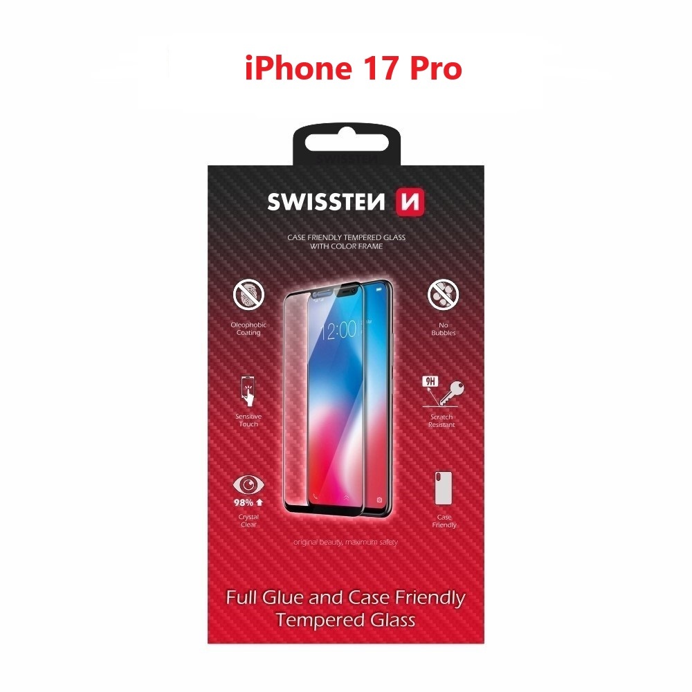 SKLO SWISSTEN FULL GLUE, COLOR FRAME, CASE FRIENDLY PRO APPLE IPHONE 17 PRO ČERNÉ