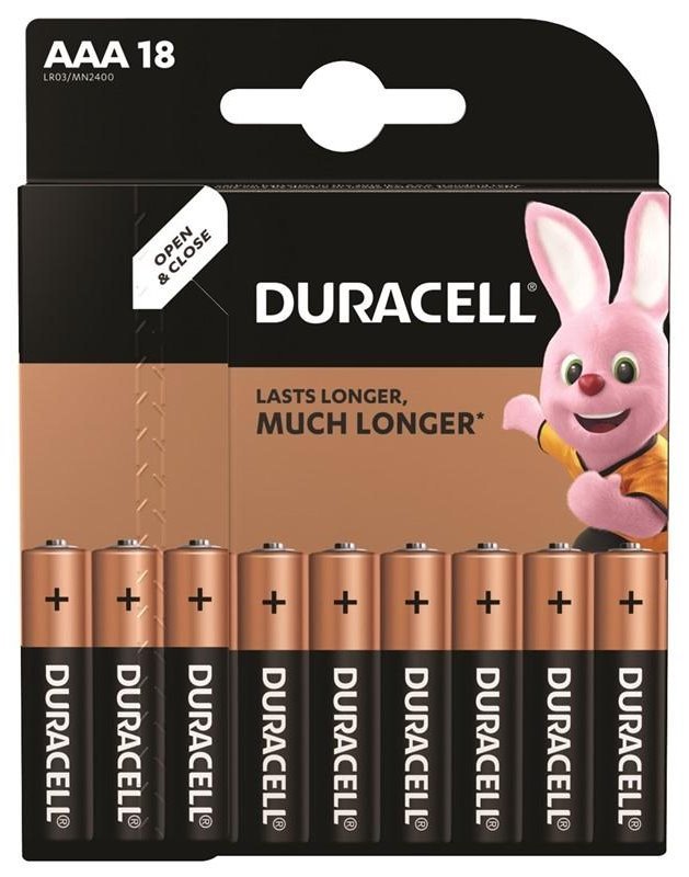 Baterie Duracell Basic to uniwersalne baterie alkaliczne, odpowiednie do zwykłych urządzeń. Solidne zamknięcie górnej części nylonem pomaga zapobiegać wyciekaniu baterii. Technologia Duralock utrzymuje nieużywane baterie Duracell w stanie jak nowe i naładowane nawet do 10 lat podczas zwykłego przechowywania. Opakowanie zawiera 18 sztuk baterii.