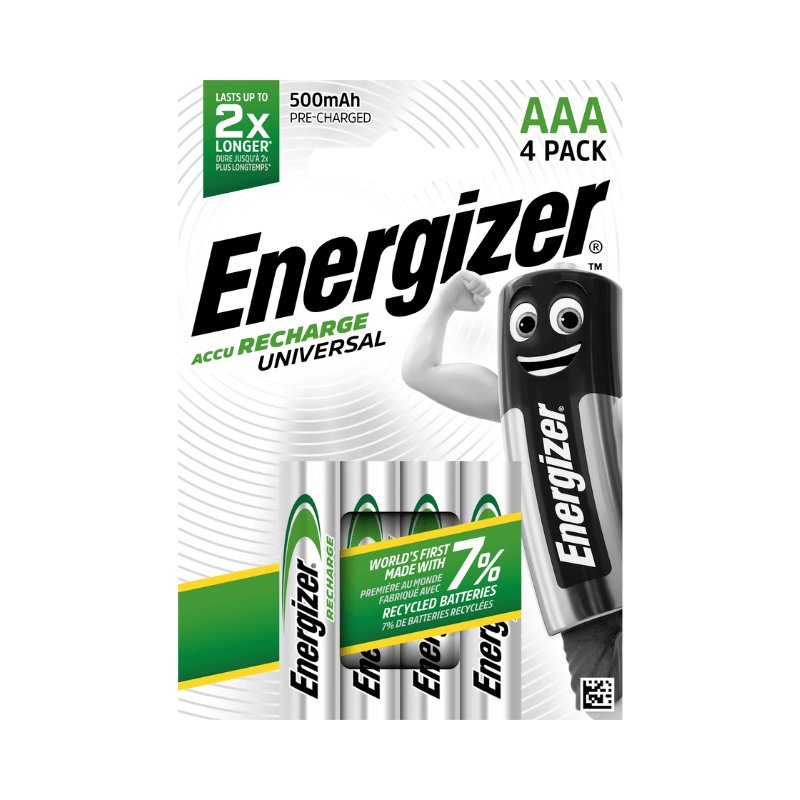 Nabíjecí baterie AAA / HR03 - 500 mAh UNIVERSAL Energizer. Specifické vlastnosti: alternativní označení: HR03, AAA, R03, mikrotužka typ: nabíjecí mikrotužka NiMh RTU přednabitá kapacita: min. 500mAh nová technologie, nízké samovybíjení stovky dobíjecích cyklů Nejlepší značka dobíjecích baterií na světě podle údajů průzkumu trhu Doporučeno pro: CD přehrávače hračky na dálkové ovládání hry přenosné počítače organizéry