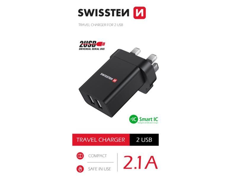 Kvalitní nabíječka s výstupním proudem 2,1A , technologií Smart IC, dvěma výstupy USB a vidličkou pro UK zásuvky. Baleno v blistru SWISSTEN.
