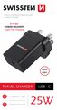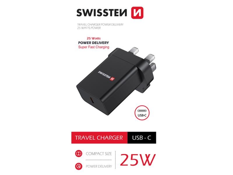 Nabíječka má výstupní port USB-C s technologií Powerdelivery pro Apple i Super fast charging pro Samsung, vidličkou pro UK zásuvky a výstupní výkon 25W. Baleno v blistru SWISSTEN.
