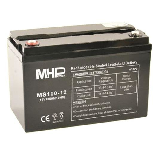 Olověný akumulátor MHPower VRLA AGM o kapacitě 100 Ah(MS100-12) a napětí 12 V slouží jako záložní zdroj proveškeré aplikace EZS a telekomunikace, záložnísvítidla a nabíjecí svítilny, výstražná mobilní a signalizační zařízeníapod.MS100-12 se řadí mezi olověné hermeticky uzavřené a zcelabezúdržbové...