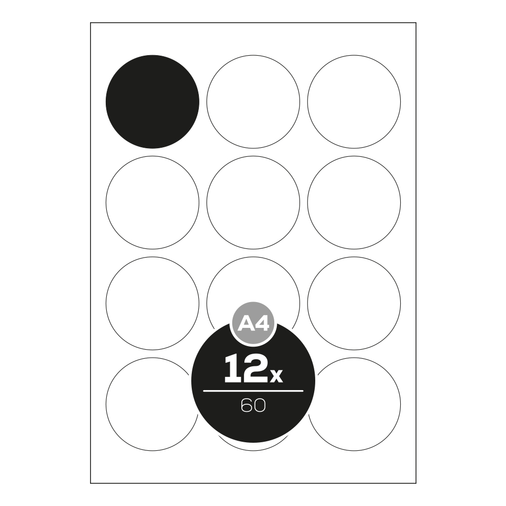 Etikety PRINT A4 / 100 ks, kruhové 60 - 12 etiket, bílé. Kruhové print etikety s bezpečnostním okrajem. Samolepicí etikety jsou vyrobeny na arších formátu DIN A4. Jsou určeny pro použití v kopírovacích strojích, laserových i inkoustových tiskárnách. Vyznačují se přesným výsekem a minimální prašností. Bezpečnostní okraj po celém obvodu archu brání vytékání lepidla a tak chrání vaši tiskárnu před poškozením.