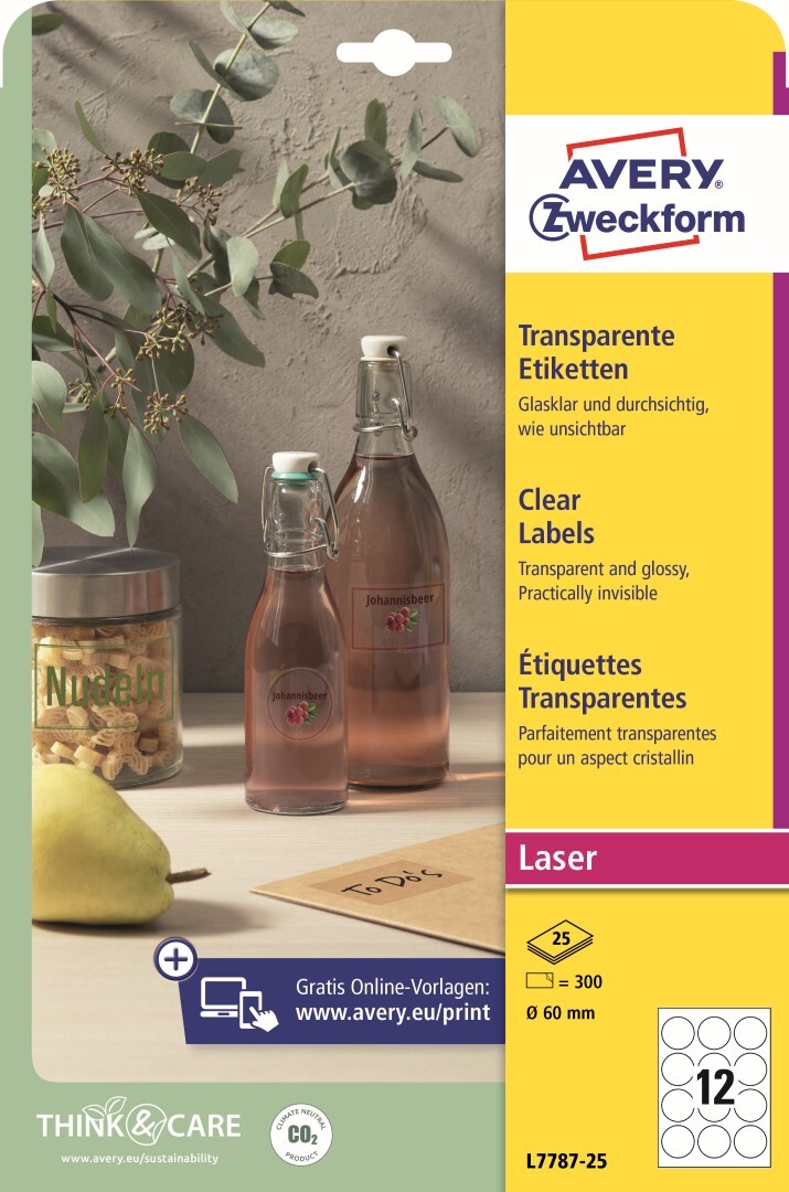 Avery Zweckform L7787-25 Čiré etikety Ø 60 mm, 300 ks, 25 archů A4, lesklá PET fólie