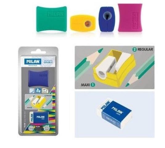 Temperówka MILAN DOUBLE z satynową, jedwabistą powłoką w dotyku jak gumka. Temperówka podwójna zarówno na grube, jak i cienkie ołówki i kredki z pojemnikiem na ścinki. Bezpieczne ostrze ze stali węglowej. Idealna do piórnika. Gumka MILAN 2424: miękka gumka syntetyczna do ścierania większości rodzajów grafitu z każdego rodzaju papieru.