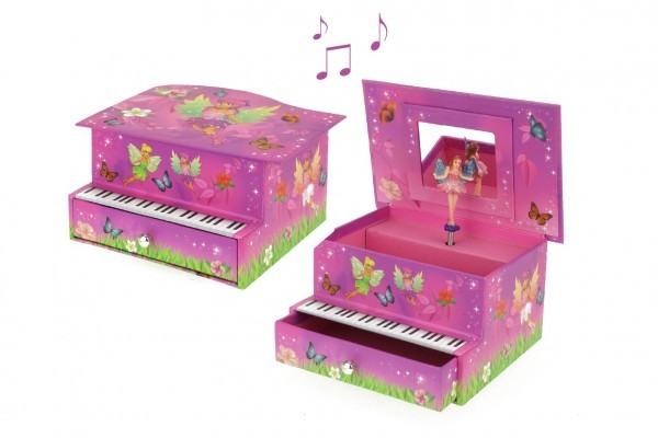 Každá malá parádnice musí mít svoji šperkovnicim, to je přeci jasný! Tato šperkovnice ve tvaru piána obsahuje přehrádku i volný prostor takže do ní lze snadno srovnat všechny šperky. Na spodní straně víka je zrcadlo, před kterým je víla. Stačí zezadu natočit klíček a víla se točí a hraje...